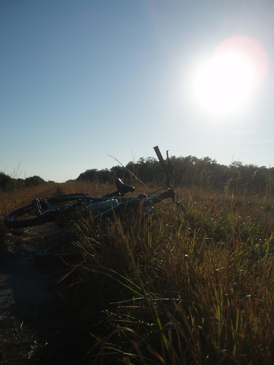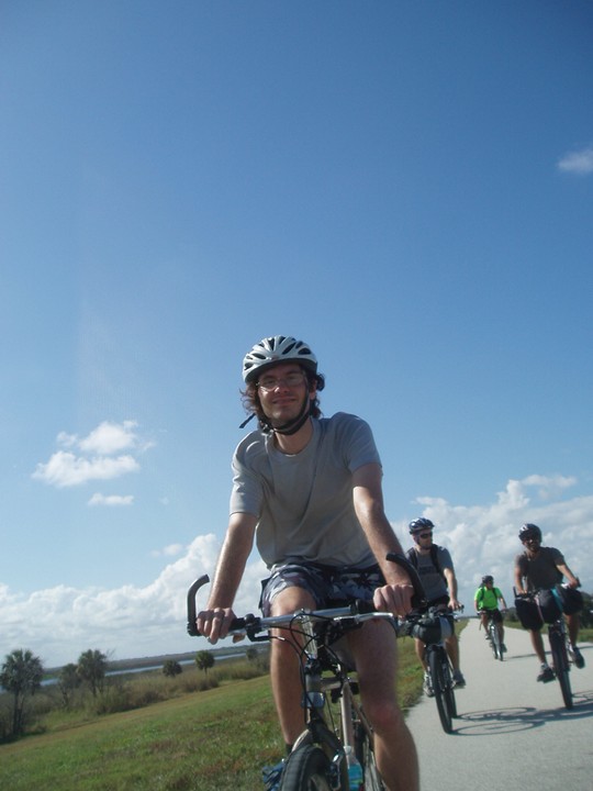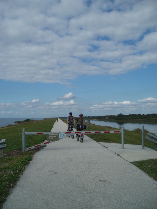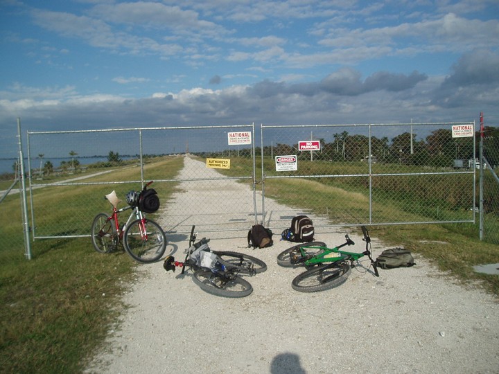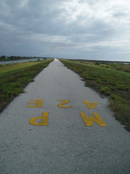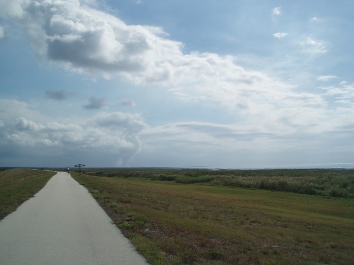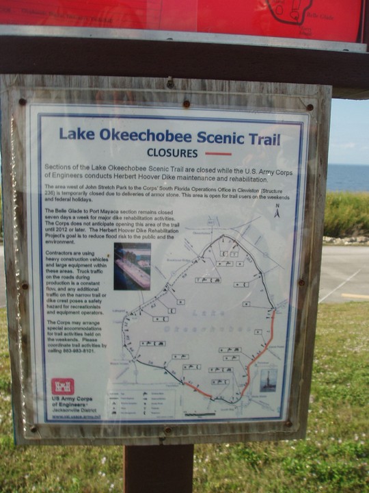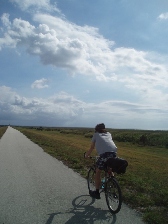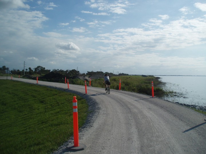 Warnings: About half the trail (Okeechobee clockwise to Moore Haven) is nicely paved or easy dirt (except for a few sections that are closed for construction and require detours through towns or hopping fences). The other half is terrible rocky double track - I would recommend strongly against doing this half unless you have 29" extra-wide tires. There are very few signs and it is quite easy to get badly lost (I spent 4 hours biking through cattle ranches). The towns along the way are very culturally interesting with lots of ethnic food options. Except in the dead of winter, bugs are very bad at dusk. Clewiston has cheap hotels (~$40), but there are lots of platforms along the trail that fit one person each - there are also unsigned primitive campsites in some places. Biking at night is a viable option on the first half, but watch out for gates and other obstacles.